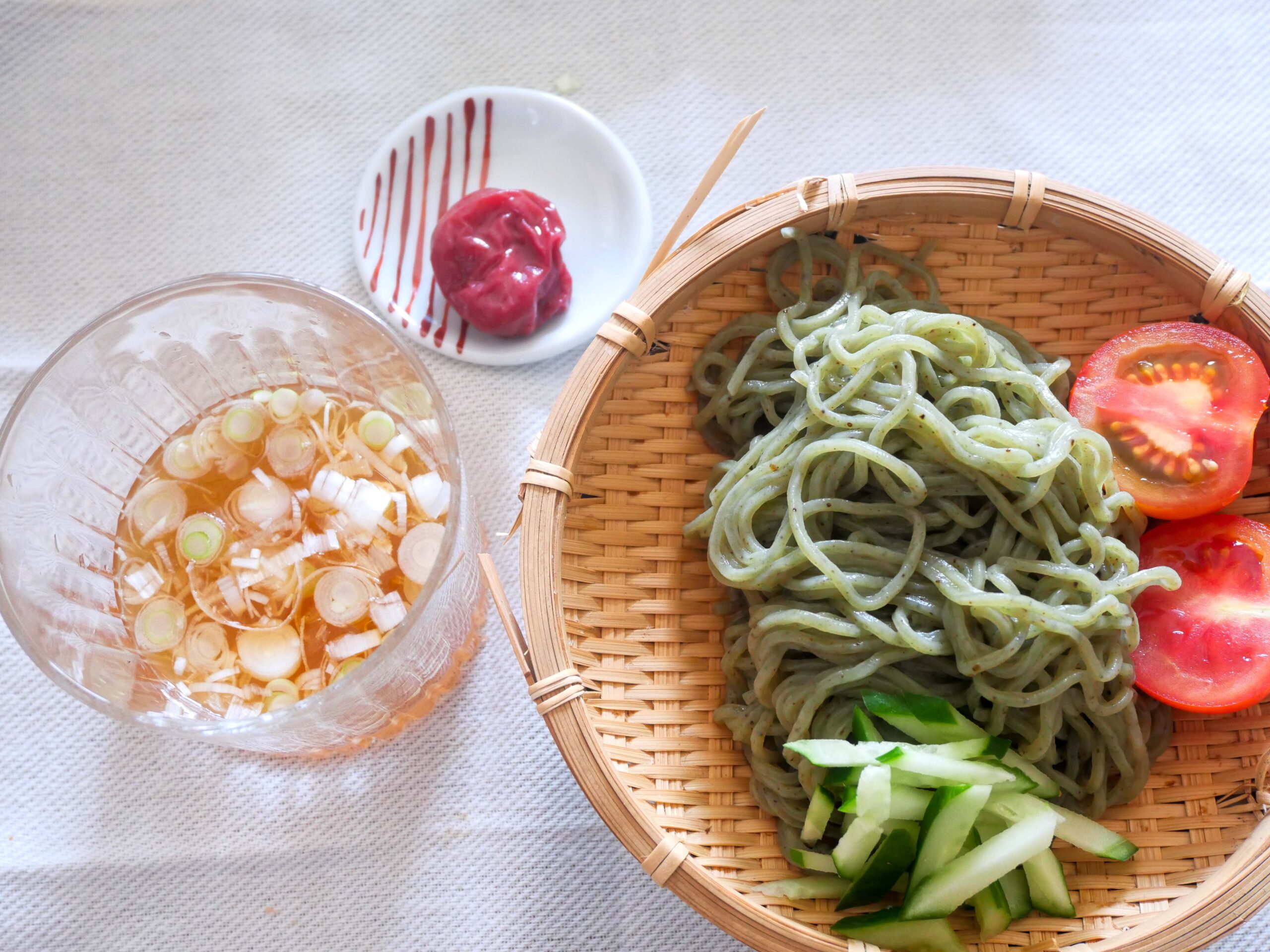 久しぶりにいい天気となった。先日のキャンプで初めてお会いした秋田の旅友から頂いた、涼麺でランチ。男鹿のギバサを練りこんだ麺。