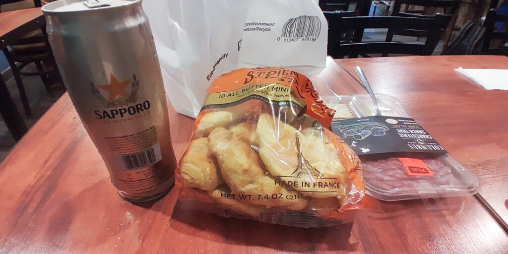ミニクロワッサン 10個10$、水 3$、ハム・チーズセット 3$、サッポロビール 5$、