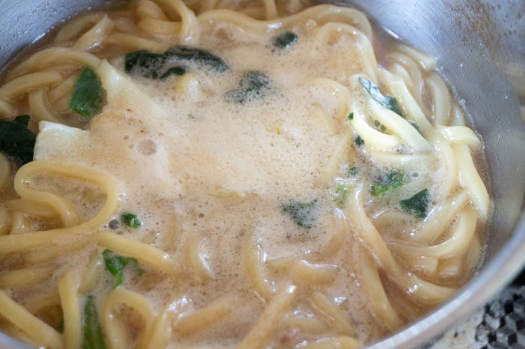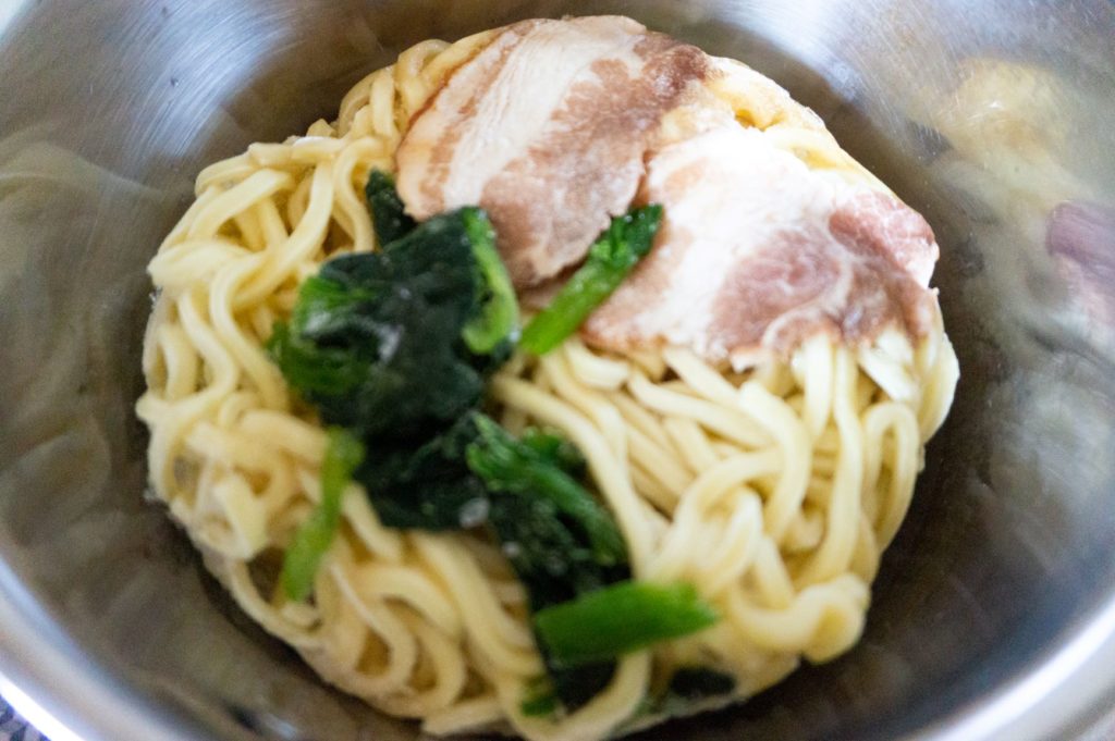 スープの上に太めのラーメン、チャーシュウ、ホウレンソウが凍って一体化してる。鍋にこのまま水なし、凍ったままで炊く。