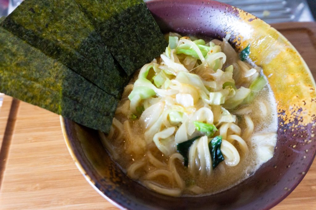 炒めた野菜、にんにく、しょうがのすりおろしを入れて、付いてきた海苔もトッピング。