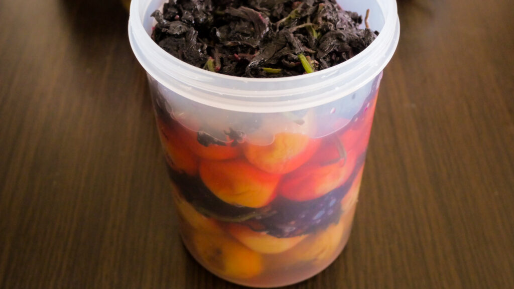 昼食後は、紫蘇も出回ってきたので、1回目漬けた梅にもみ紫蘇を追加。