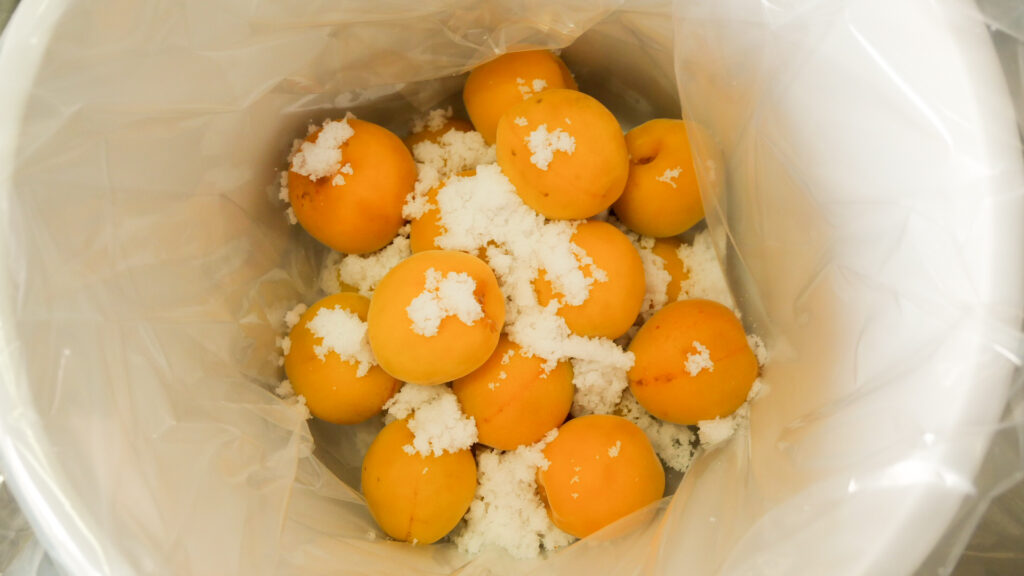 樽につけもの袋をセットして、まずは底に塩をさっとひいて、梅を敷く。