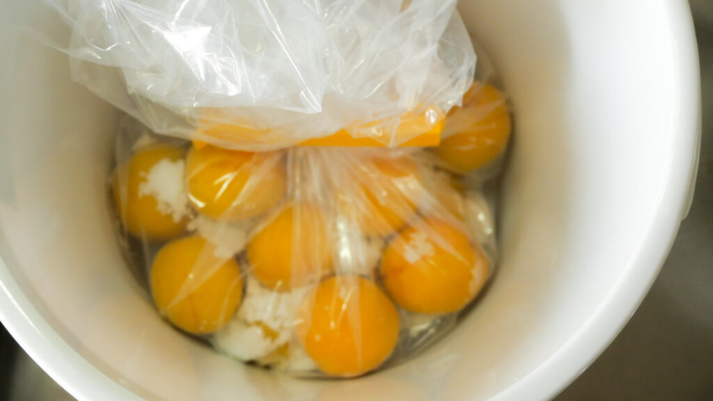 今日はとっておきの梅なのでここも丁寧に、樽でしこむことにしたので、強度のあるつけもの袋をつかう。