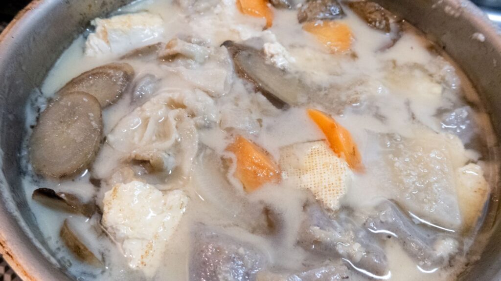 ごぼうたくさん。にんじん、だいこん、こんにゃく、やきとうふ、主役の豚はいつもの豚バラ。