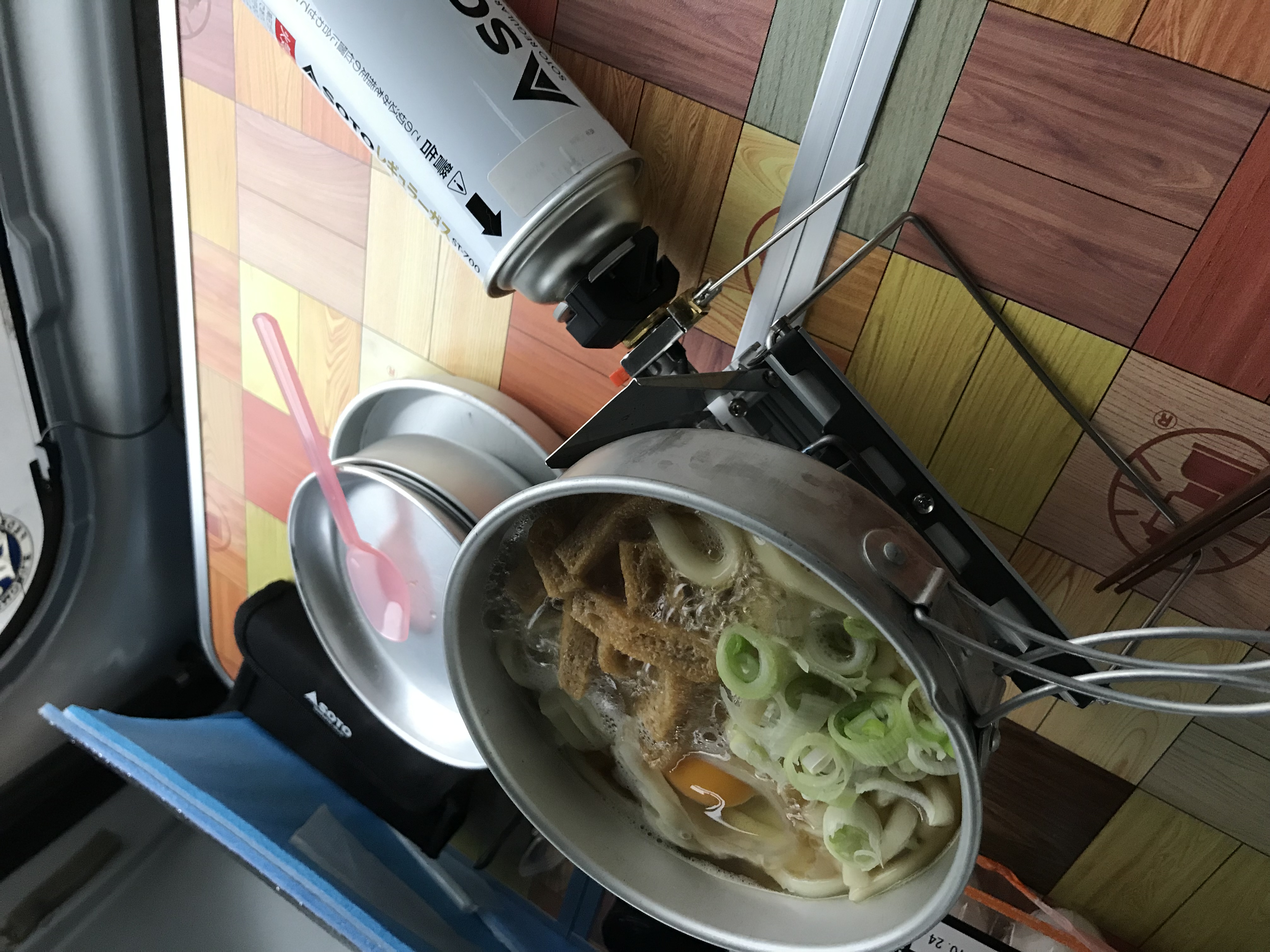 着いたのは午後2時を回っていた。 車内を整理して、遅い昼ごはん。 たまごを落として、味付きの油揚げ、刻んで持ってきたネギをトッピングして、いただきます!美味いなあ。