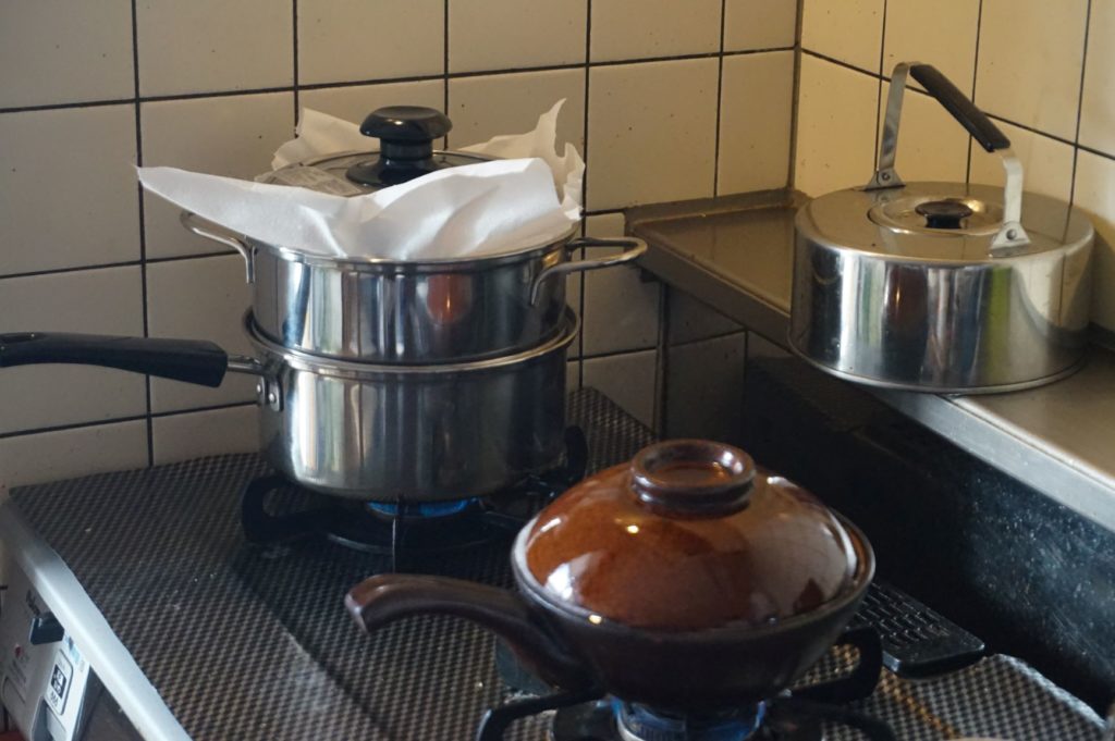 土なべで炊き始めのころは、つきっきりで火の強さを気にしていたが、あれこれ試しているうちに、再弱にしてあとは放置。沸騰した泡の具合だけ見て炊けたか判断。蓋は絶対開けない。その後20分~30分蒸らしておく。蒸らしている間に、おかずや、みそ汁を準備。