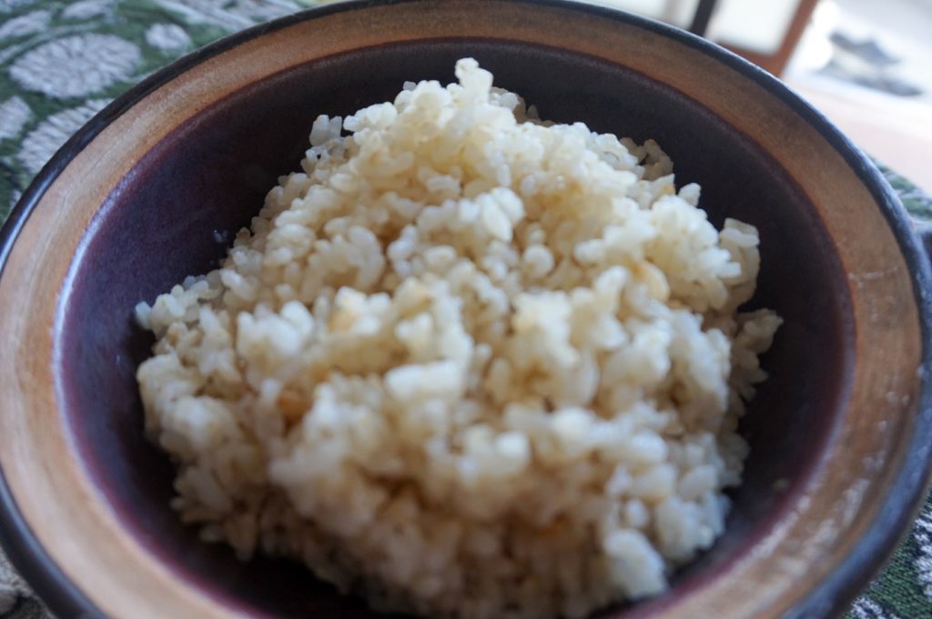 ご飯は、玄米を土なべで炊く。1合で3食分。ご飯は昼と夜食べないので、朝食3日分だ。ご飯を減らして蒸し大豆をプラス。