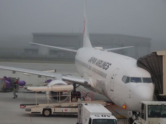 濃霧で視界が悪いので、羽田からの便が引き返す場合もあると言ってる。