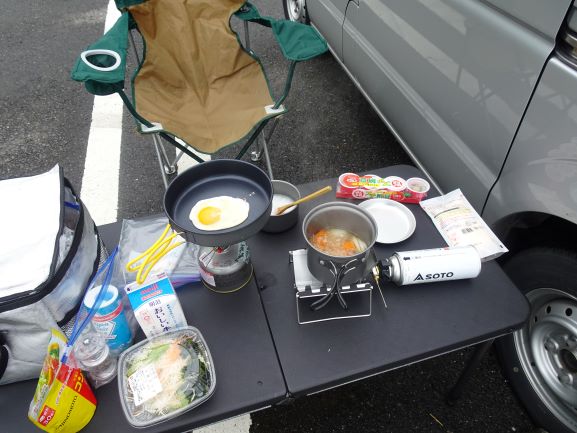 SOTOのストーブ2台で、たまねぎと人参のコンソメスープ、目玉焼き、を作って、レトルトのお粥をあっためて完成。納豆と牛乳。野菜サラダ。